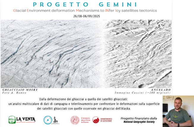 Il progetto GEMINI (Glacial Environment deformation Mechanisms to INfer Icy satellites tectonics), finanziato dal National Geographic Grant Program, premia il progetto scientifico di Costanza Rossi dell'INAF - Osservatorio Astronomico di Padova. Con il coinvolgimento del Dipartimento di Geoscienze dell'Università di Padova e il supporto tecnico-logistico dell'associazione La Venta Esplorazioni Geografiche, GEMINI esplora il legame tra le fratture osservate nei ghiacciai dell'Alaska e quelle presenti sulla superficie dei satelliti ghiacciati di Giove e Saturno, come Ganimede, Europa ed Encelado.