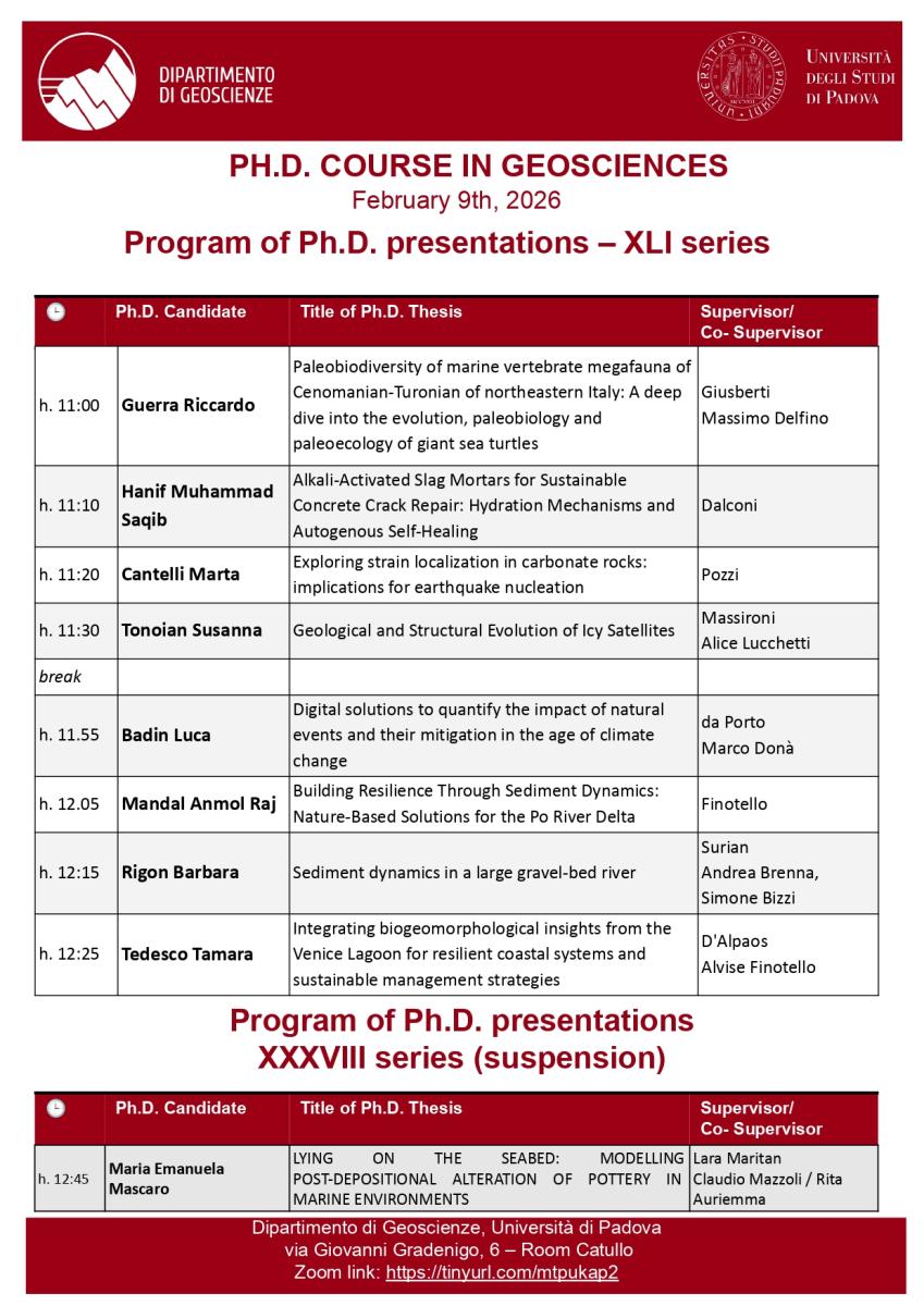 Ph.D. Course in Geosciences - presentazioni progetti XLI ciclo e presentazione finale dottorandi XXXVIII ciclo con sospensione - 9 Febbraio 2026