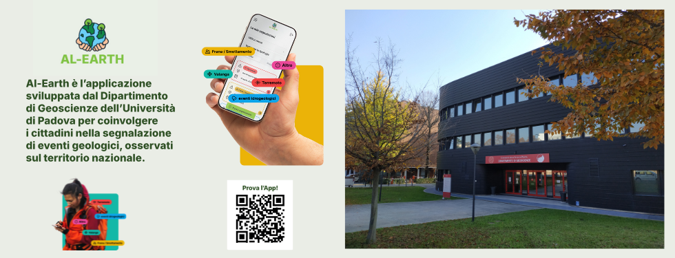 Il Dipartimento di Geoscienze dell’Università di Padova presenta Al-Earth, una nuova applicazione mobile gratuita rivolta ai cittadini per la segnalazione di eventi e fenomeni geologici osservabili sul territorio, come terremoti, frane o alluvioni.
