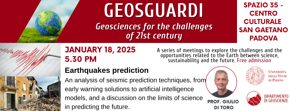 On January 18, 2025, as part of the GeoSguardi: Geosciences for the Challenges of the 21st Century seminar series, Prof. Giulio Di Toro will discuss one of the most complex and crucial issues for our country: earthquake prediction. The event will take place at the Centro Culturale San Gaetano (Spazio 35) in Padua, starting at 5:30 PM, with free admission.