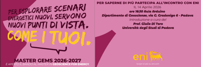 Speakers: Dr. Giancarlo Davoli, Dr. Fabio La Valle, Dr. Giovanni Scrofani - ENI Italia. | Tuesday 14 April 2026 | 4,30 p.m. - Arduino Classroom - Introduction: Prof. Giulio Di Toro (Dipartimento di Geoscienze)